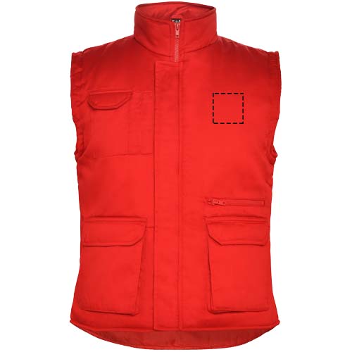 Veelzijdige werkbodywarmer met hoge kraag. Rits aan de voorkant met bandje en klittenbandsluiting. Eén buitenvak voor je telefoon aan de rechterkant. Twee zakken met inzetstukken aan de voorkant en zijsplitten. Twee kleine vakjes voor pennen. Eén binnenzak met klittenbandsluiting. Zakje met rits. Drop tail. Versteller met klittenband.