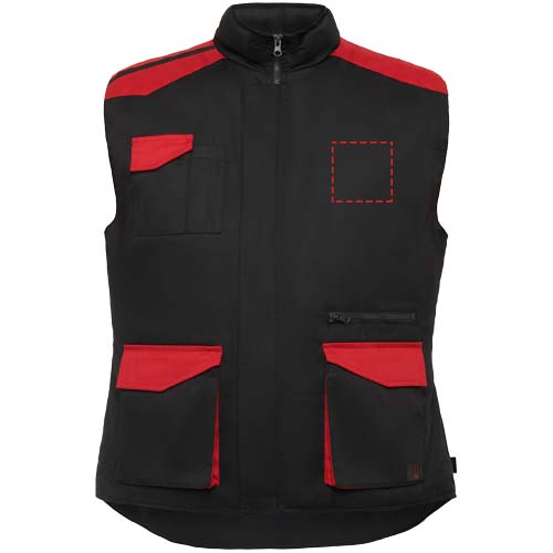 Werkvest met meerdere zakken in een tweekleurige combinatie, met hoge kraag. Rits aan de voorkant met klittenbandsluiting. Windbreakers in manchetten. Buitenvak voor je telefoon aan de rechterkant, met flap en klittenbandsluiting. Twee geplooide voorzakken met flap en klittenbandsluiting. Twee pennenvakken. Binnenzak met klittenbandsluiting. Zak met rits. Drop tail. Automatische aanpassing. Contrasterende schouderstukken en details.