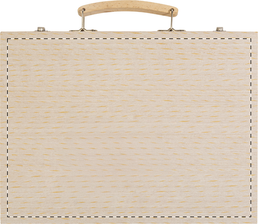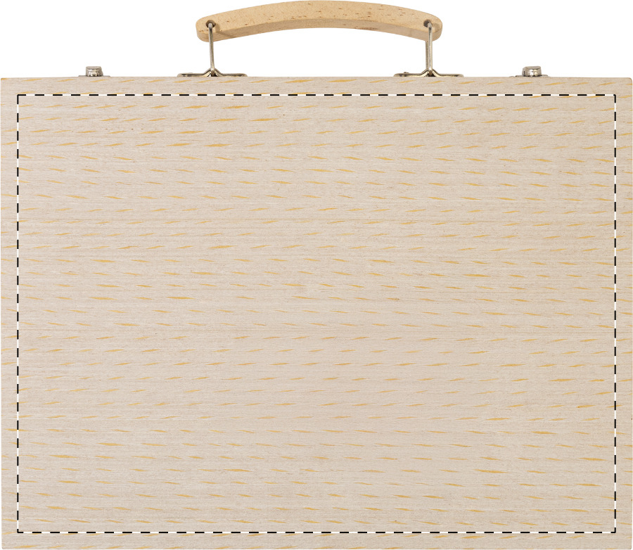 Uitgebreide teken- en kleurset van 66 stuks voor kunstenaars in een houten draagtas. Inclusief: 12 waskrijtjes, 12 oliepastels, 12 potloden, 12 stiften, 12 aquarelverven met palet en bursh, liniaal, gum, slijper en lijm.
