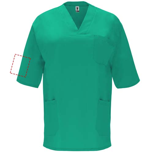 Unisex-servicehemd met korte mouwen. Gekruiste piekhalslijn. Zak op de borst en twee zijzakken. Zijsplitten aan de zoom.