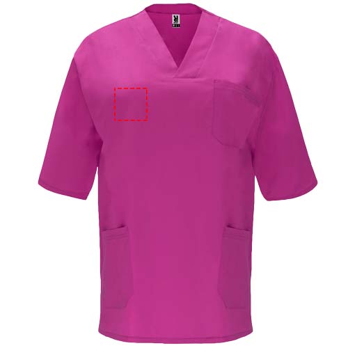 Unisex-servicehemd met korte mouwen. Gekruiste piekhalslijn. Zak op de borst en twee zijzakken. Zijsplitten aan de zoom.