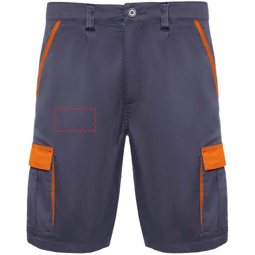 Korte werkbroek in een kleurencombinatie. Comfortabele en verstelbare stof. Elastische tailleband aan de achterkant. Contrasterende riemlussen, flappen, plooien en afwerkingen. Twee zakken aan de voorkant. Twee achterzakken met flap en klittenbandsluiting. Twee geplooide zijzakken met flap en klittenbandsluiting.