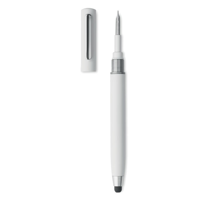 Balpen met draaimechanisme en stylus van ABS. Met reinigingsset voor TWS oorddopjes: metalen nopje, sponsje en borsteltje. Blauwe inkt.