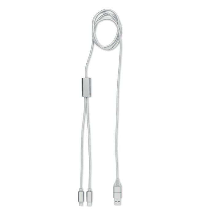 Oplaadkabel van aluminium met 2-in-1 type-C <(>&<)> type-A en micro-B (2-in-1- pin) ingang en Type C en micro B uitgang. Kabellengte: 120 cm.