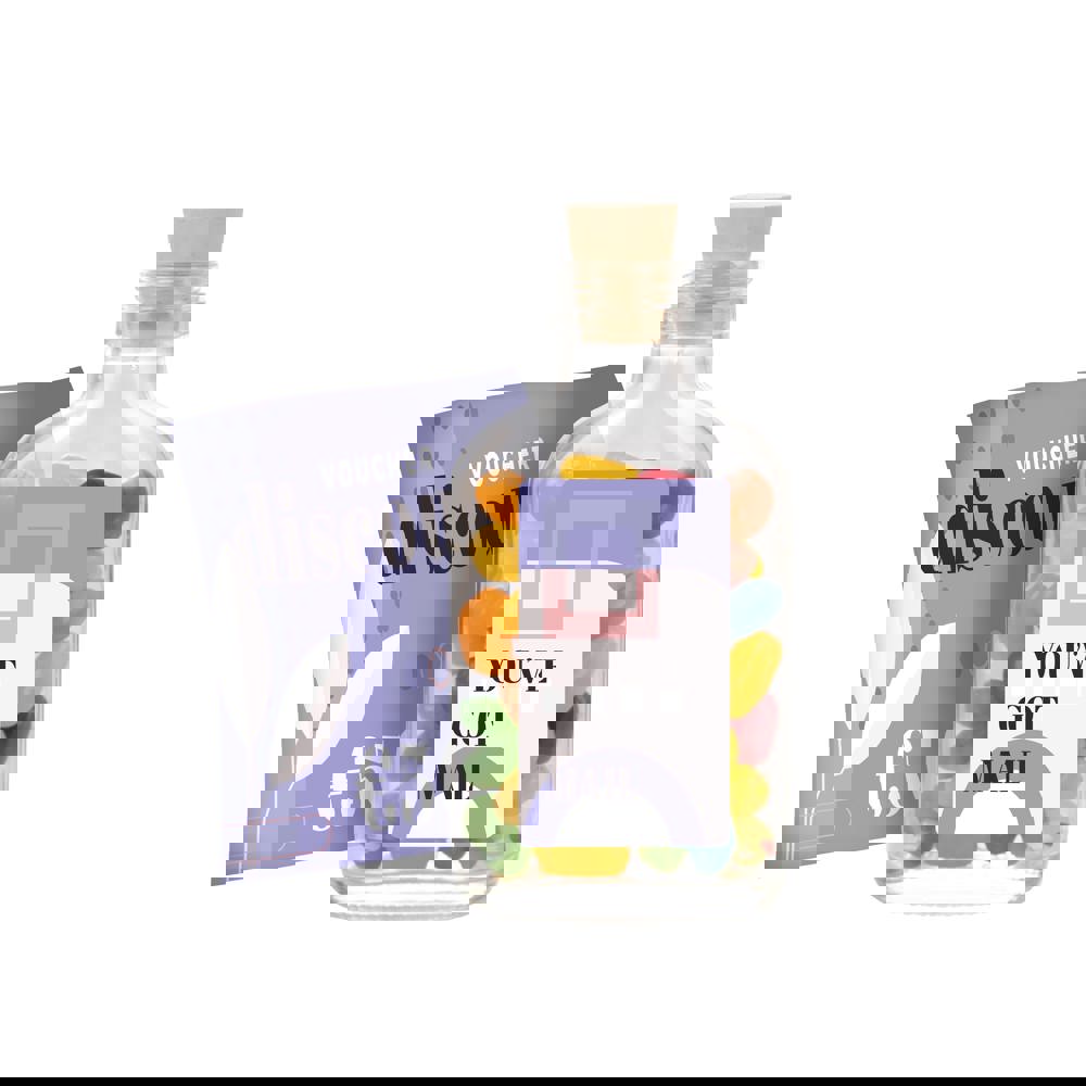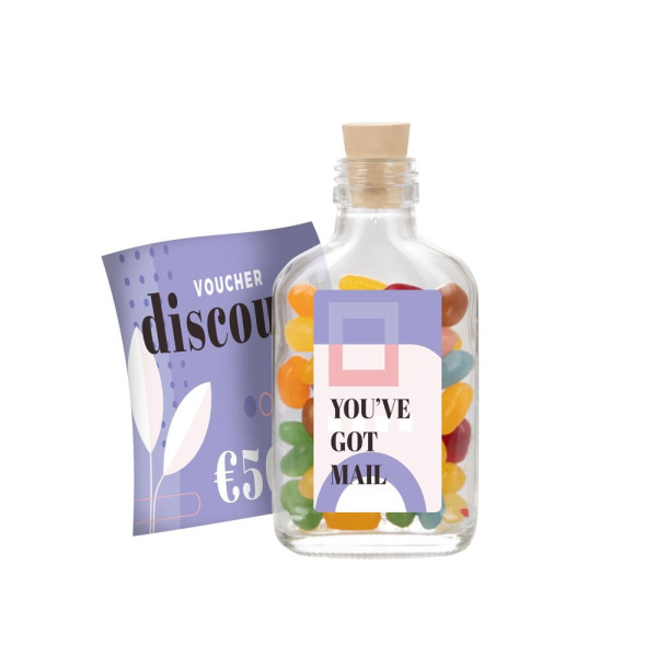 Glazen flesje voorzien van een full colour sticker op de voorzijde en een bedrukte (opgerolde) brief in het flesje, gevuld met ca. 75 gram jelly beans