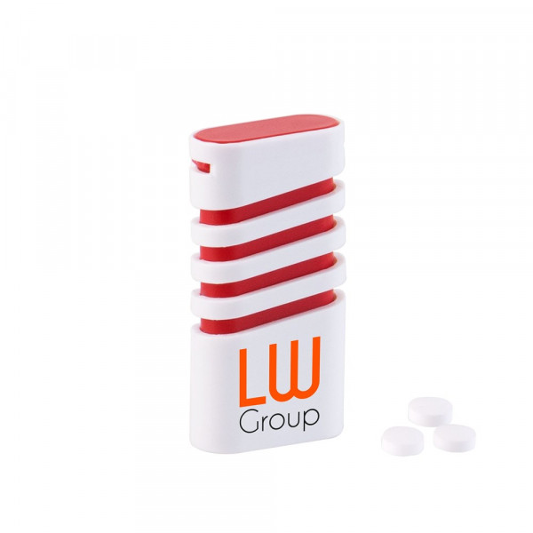 Spring dispenser zwart voorzien van een full colour bedrukking op de voorzijde, gevuld met ca. 5 gram mini pepermuntjes