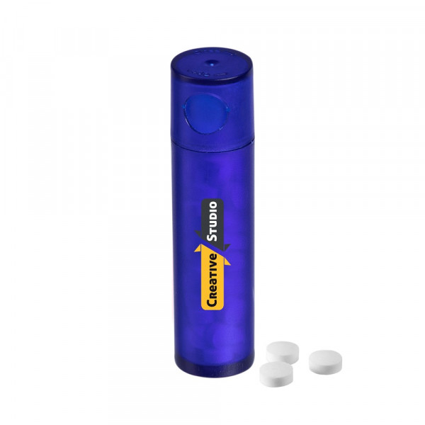 Zwart mintkokertje voorzien van een full colour bedrukking aan de voorzijde, gevuld met ca. 7 gram mini pepermuntjes