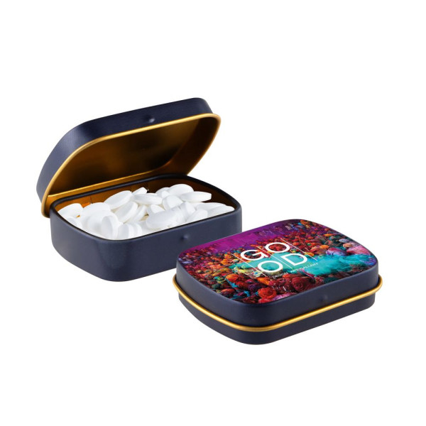 Mini scharnierblikje wit met ca. 23 gram pepermunt en voorzien van een full colour bedrukking. Inclusief ingrediëntensticker en seal.