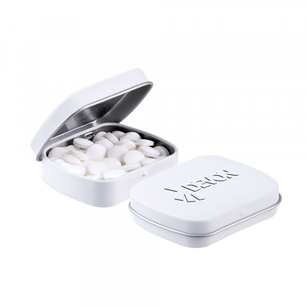 Mini scharnierblikje wit met ca. 23 gram pepermunt en voorzien van embossing. Inclusief...meer