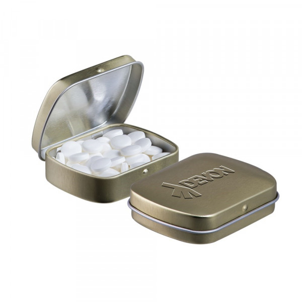 Mini scharnierblikje wit met ca. 23 gram pepermunt en voorzien van embossing. Inclusief...meer