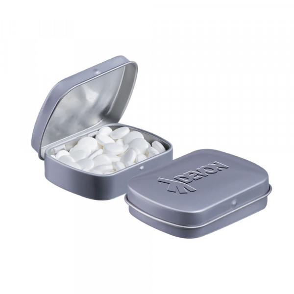 Mini scharnierblikje wit met ca. 23 gram pepermunt en voorzien van embossing. Inclusief...meer