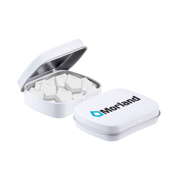 Mini scharnierblikje wit met ca. 23 gram logo pepermunt voorzien van een full colour bedrukking. Inclusief ingrediëntensticker en seal.