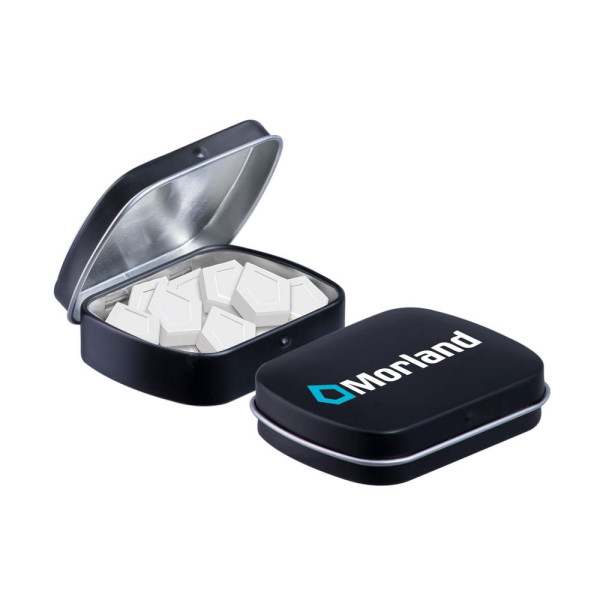 Mini scharnierblikje wit met ca. 23 gram logo pepermunt voorzien van een full colour bedrukking. Inclusief ingrediëntensticker en seal.