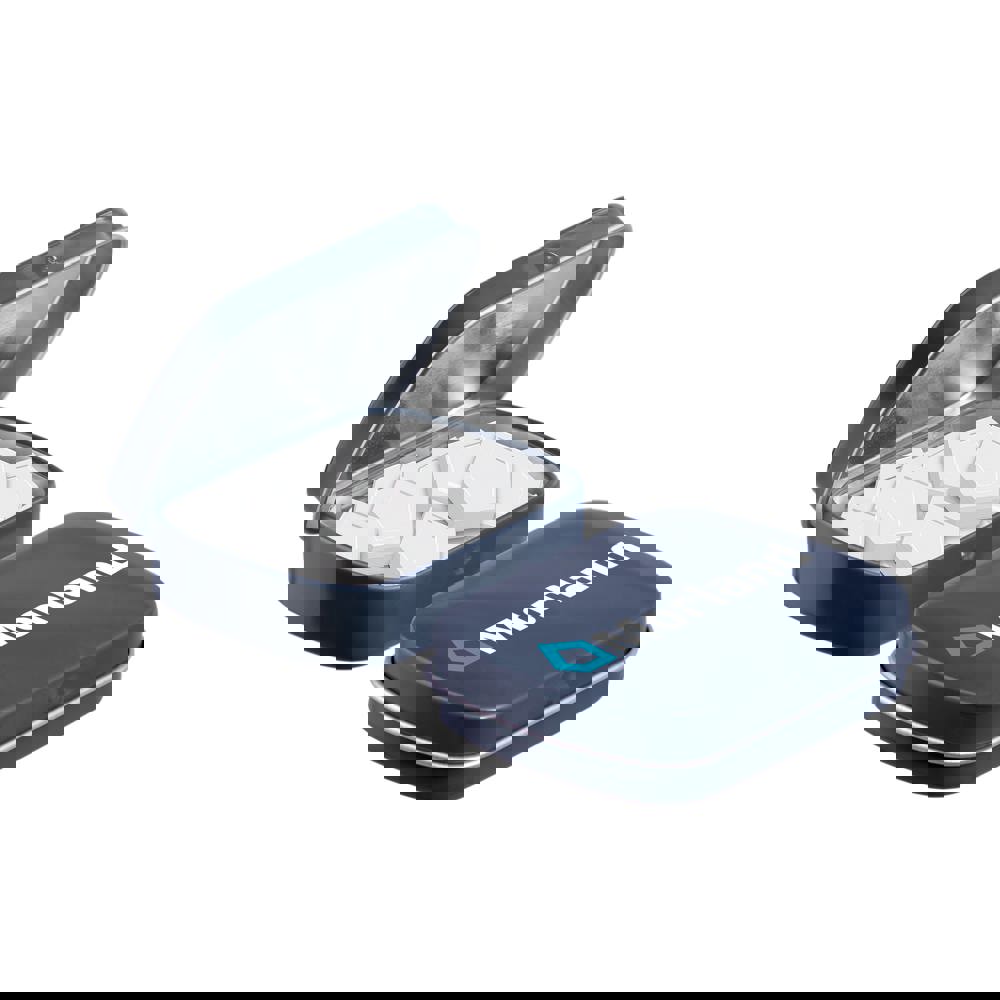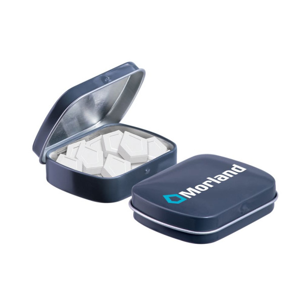 Mini scharnierblikje wit met ca. 23 gram logo pepermunt voorzien van een full colour bedrukking. Inclusief ingrediëntensticker en seal.