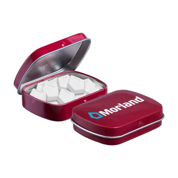 Mini scharnierblikje wit met ca. 23 gram logo pepermunt voorzien van een full colour bedrukking. Inclusief ingrediëntensticker en seal.