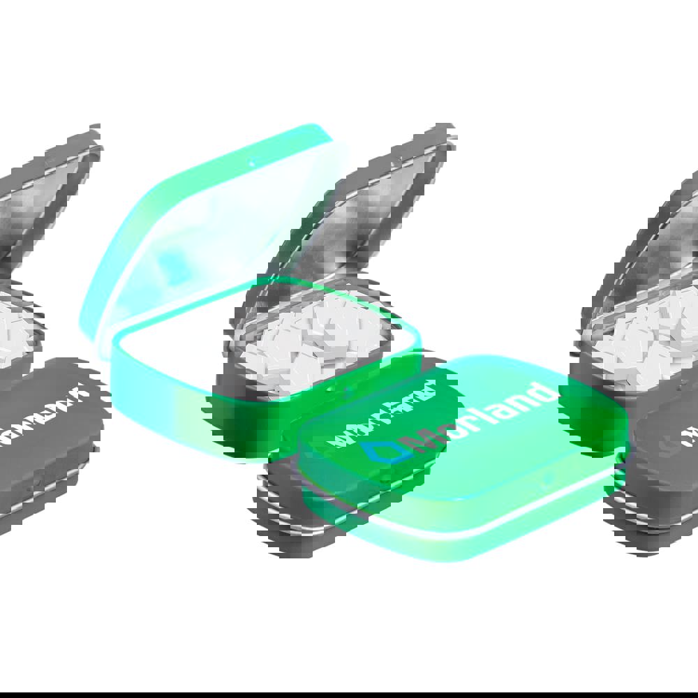 Mini scharnierblikje wit met ca. 23 gram logo pepermunt voorzien van een full colour bedrukking. Inclusief ingrediëntensticker en seal.