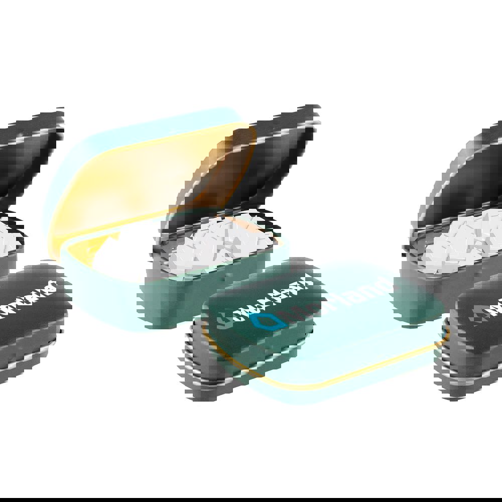 Mini scharnierblikje wit met ca. 23 gram logo pepermunt voorzien van een full colour bedrukking. Inclusief ingrediëntensticker en seal.