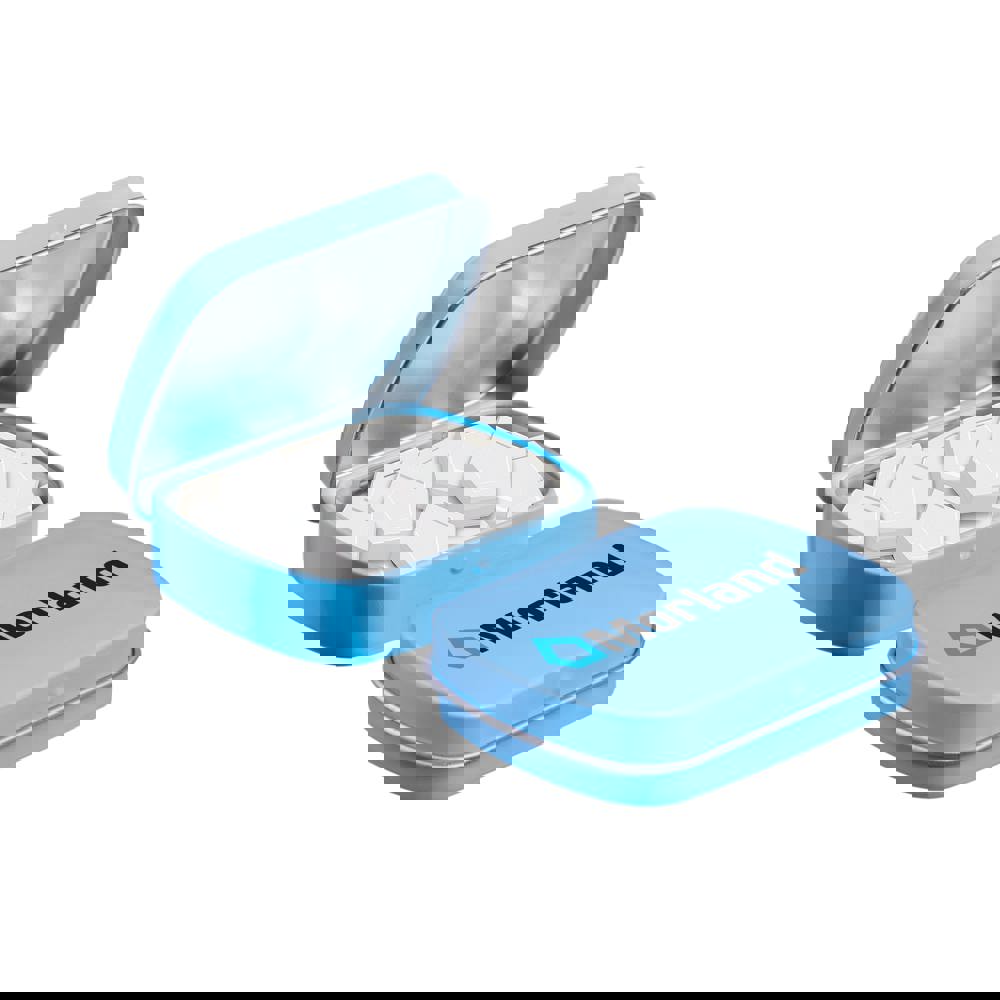 Mini scharnierblikje wit met ca. 23 gram logo pepermunt voorzien van een full colour bedrukking. Inclusief ingrediëntensticker en seal.