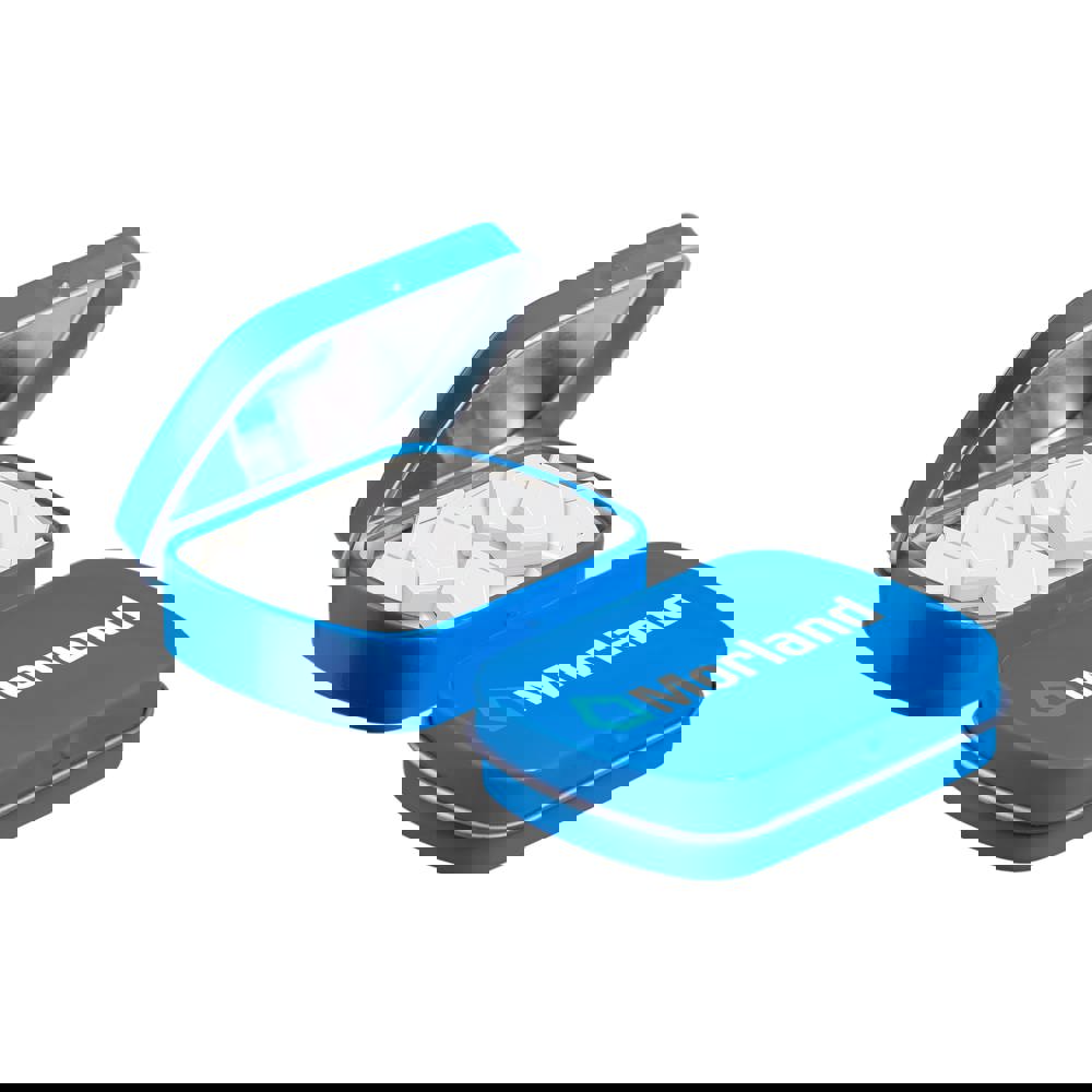 Mini scharnierblikje wit met ca. 23 gram logo pepermunt voorzien van een full colour bedrukking. Inclusief ingrediëntensticker en seal.