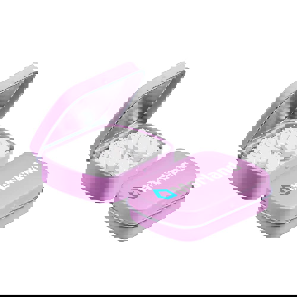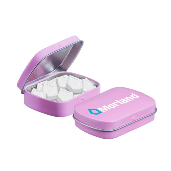 Mini scharnierblikje wit met ca. 23 gram logo pepermunt voorzien van een full colour bedrukking. Inclusief ingrediëntensticker en seal.