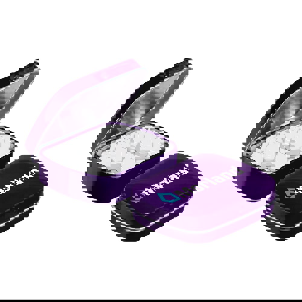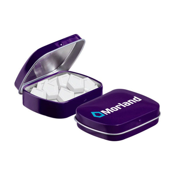 Mini scharnierblikje wit met ca. 23 gram logo pepermunt voorzien van een full colour bedrukking. Inclusief ingrediëntensticker en seal.