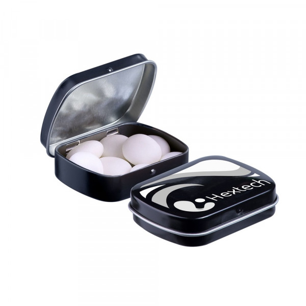 Mini scharnierblikje wit met ca. 28 gram Mentos mints en voorzien van een full colour bedrukking. Inclusief ingrediëntensticker en seal.