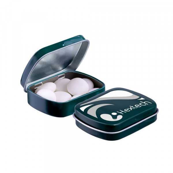 Mini scharnierblikje wit met ca. 28 gram Mentos mints en voorzien van een full colour bedrukking. Inclusief ingrediëntensticker en seal.