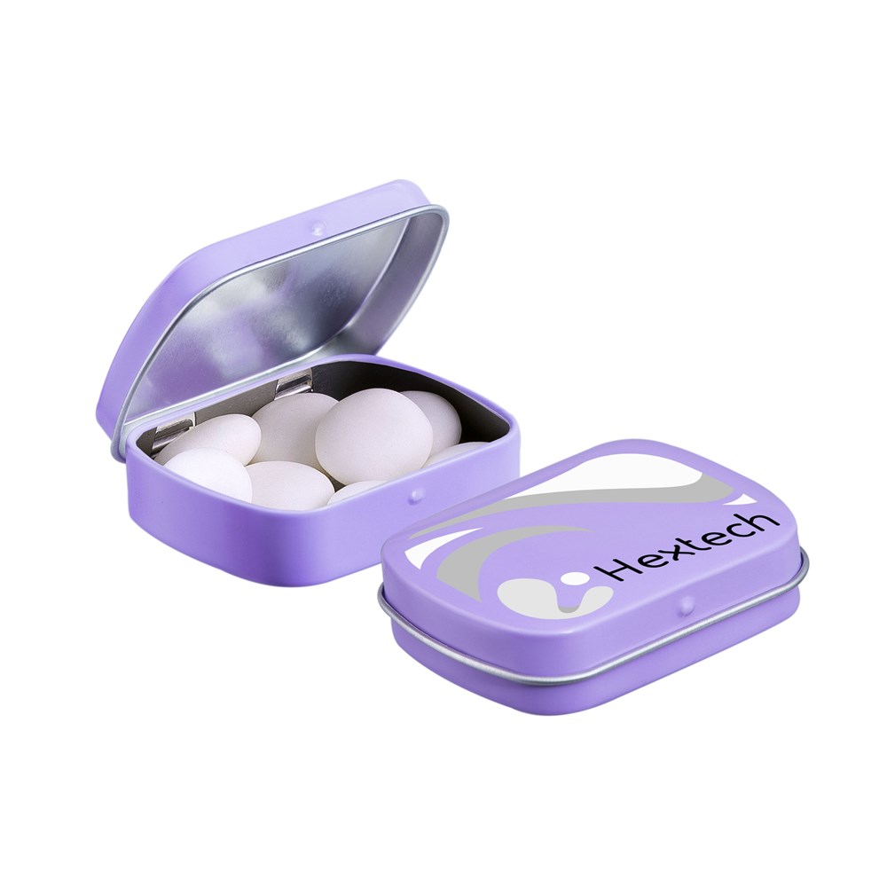Mini scharnierblikje wit met ca. 28 gram Mentos mints en voorzien van een full colour bedrukking. Inclusief ingrediëntensticker en seal.