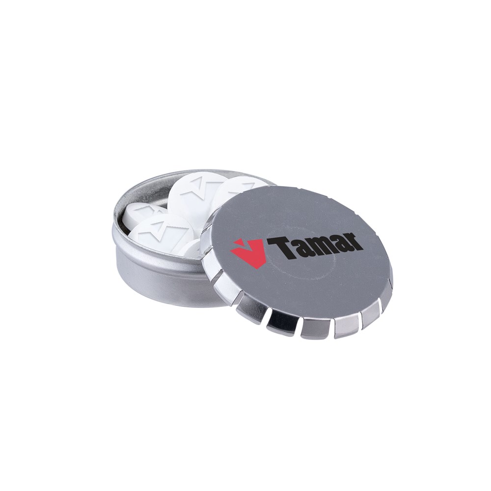 Mini clic-clac blikje zilver met ca. 23 gram logo pepermunt en voorzien van een full colour bedrukking. Inclusief ingrediëntensticker en seal.