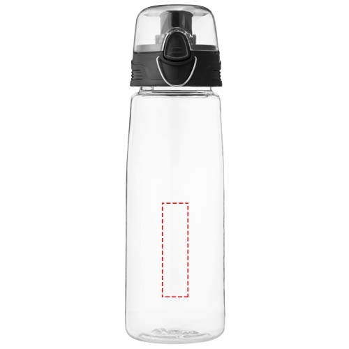 Op dorstige momenten is de lichtgewicht Capri 700 ml sportfles een redder in nood. De fles heeft een openklapbaar drinkdeksel met schenktuit, waardoor hij beschermd en schoon blijft. Met de drukknop is hij gemakkelijk te openen. De transparante fles is gemaakt van stevig vlek- en geurvrij Eastman Tritan™, waardoor hij duurzaam en BPA-vrij is.