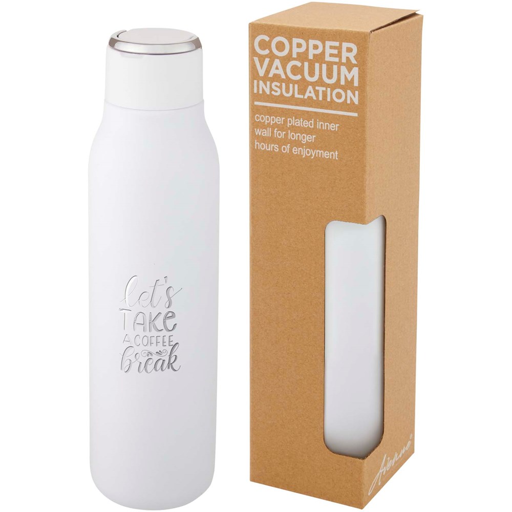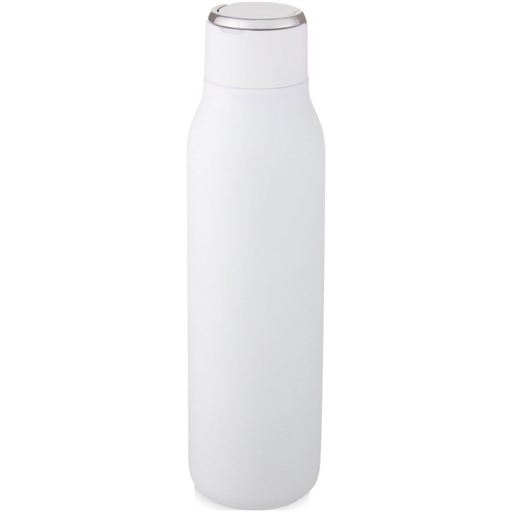 De fles van Marka heeft een roestvrijstalen vacuümconstructie met koperen isolatie die dranken enkele uren warm of koud houdt. De geïsoleerde 18/8 roestvrijstalen constructie voorkomt condensatie aan de buitenkant van de fles en de trendy poederlakafwerking maakt de fles extra duurzaam. Hij heeft ook een morsbestendig schroefdeksel en een duurzame handlus van zinklegering. BPA-vrij, getest en goedgekeurd volgens de Duitse voedselveiligheidswetgeving (LFGB). Getest en goedgekeurd voor ftalaten volgens de REACH-regelgeving. Past in de meeste standaard autobekerhouders. De inhoud is 600 ml. Handwas aanbevolen. Geleverd in een gerecycled kartonnen geschenkverpakking.
