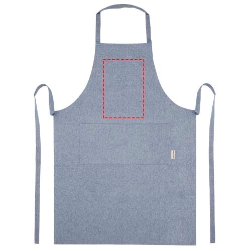 Schort gemaakt van een mix van gerecycled katoen en polyester van 200 g/m². Beschikt over 2 aangrenzende zakken met een gecombineerde afmeting van 45 x 20 cm en een bandsluiting van 1 meter aan de achterkant. Gerecycled katoen wordt vervaardigd uit voor consumenten bestemd afval dat in textielfabrieken tijdens het snijproces wordt geproduceerd. Door de aard van het productieproces kunnen er kleine variaties zijn in de kleur van het daadwerkelijke product. Lengte van de nekband: 55 cm.