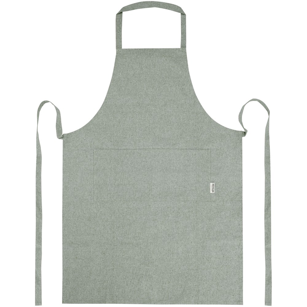 Schort gemaakt van een mix van gerecycled katoen en polyester van 200 g/m². Beschikt over 2 aangrenzende zakken met een gecombineerde afmeting van 45 x 20 cm en een bandsluiting van 1 meter aan de achterkant. Gerecycled katoen wordt vervaardigd uit voor consumenten bestemd afval dat in textielfabrieken tijdens het snijproces wordt geproduceerd. Door de aard van het productieproces kunnen er kleine variaties zijn in de kleur van het daadwerkelijke product. Lengte van de nekband: 55 cm.