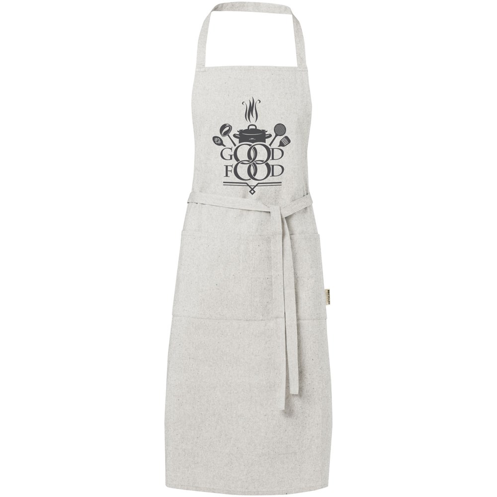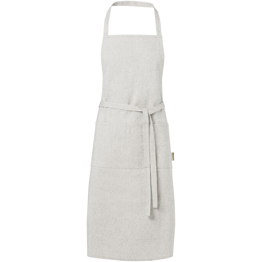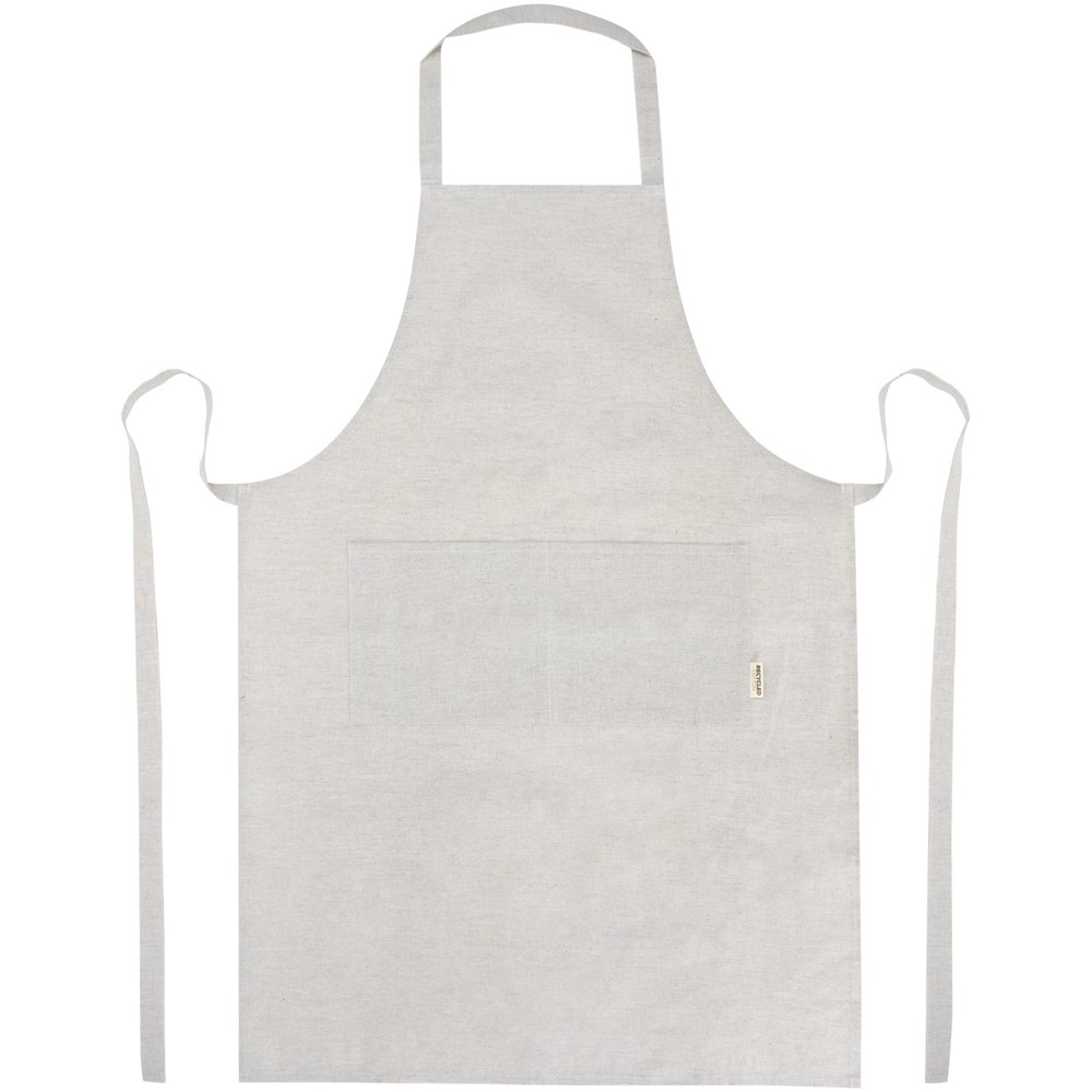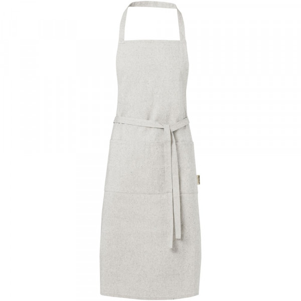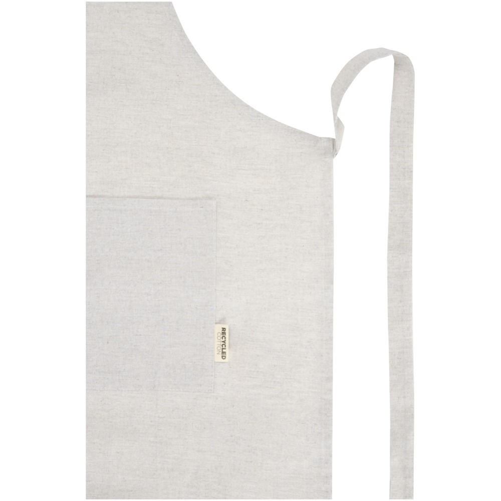 Schort gemaakt van een mix van gerecycled katoen en polyester van 200 g/m². Beschikt over 2 aangrenzende zakken met een gecombineerde afmeting van 45 x 20 cm en een bandsluiting van 1 meter aan de achterkant. Gerecycled katoen wordt vervaardigd uit voor consumenten bestemd afval dat in textielfabrieken tijdens het snijproces wordt geproduceerd. Door de aard van het productieproces kunnen er kleine variaties zijn in de kleur van het daadwerkelijke product. Lengte van de nekband: 55 cm.