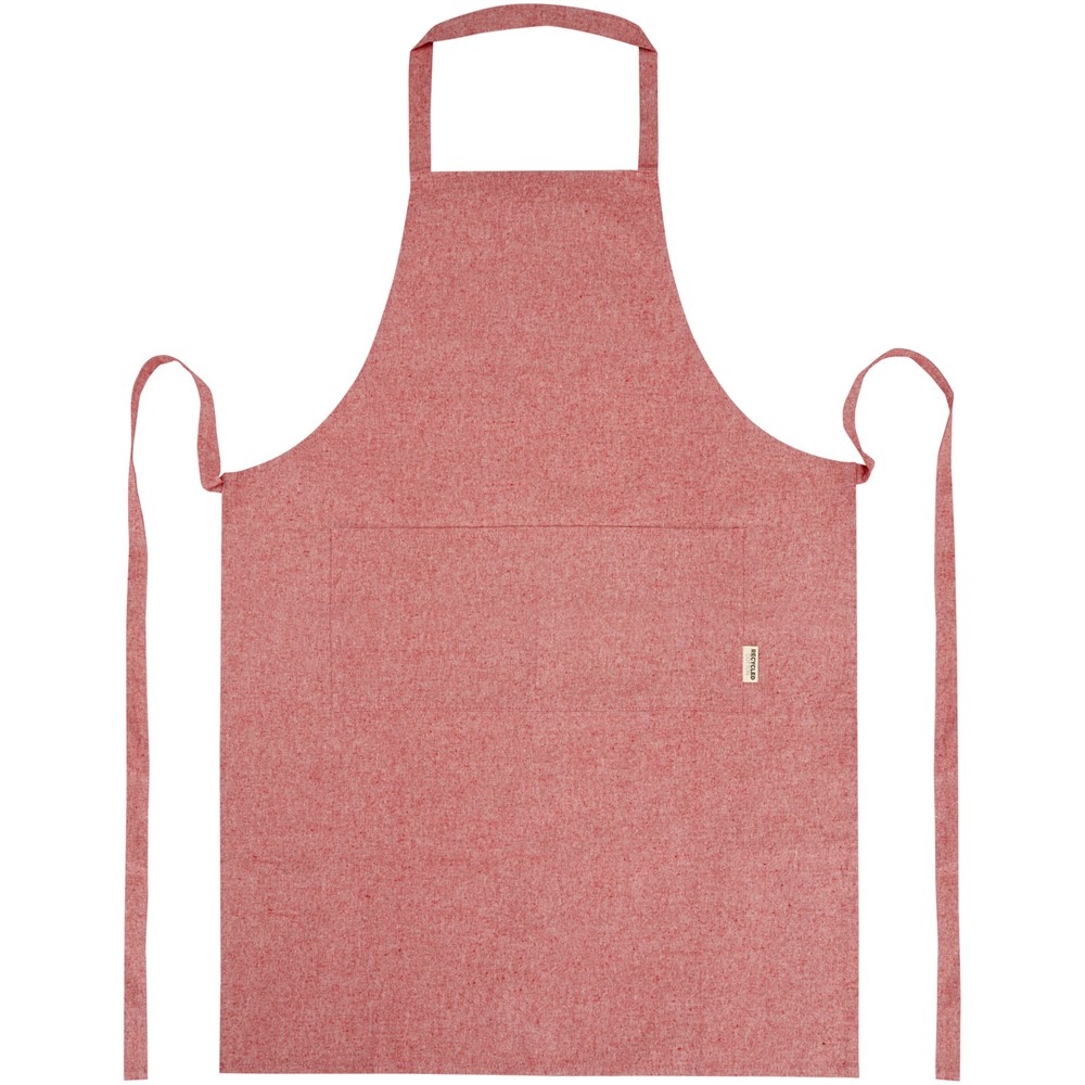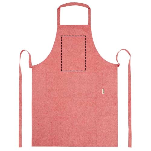 Schort gemaakt van een mix van gerecycled katoen en polyester van 200 g/m². Beschikt over 2 aangrenzende zakken met een gecombineerde afmeting van 45 x 20 cm en een bandsluiting van 1 meter aan de achterkant. Gerecycled katoen wordt vervaardigd uit voor consumenten bestemd afval dat in textielfabrieken tijdens het snijproces wordt geproduceerd. Door de aard van het productieproces kunnen er kleine variaties zijn in de kleur van het daadwerkelijke product. Lengte van de nekband: 55 cm.