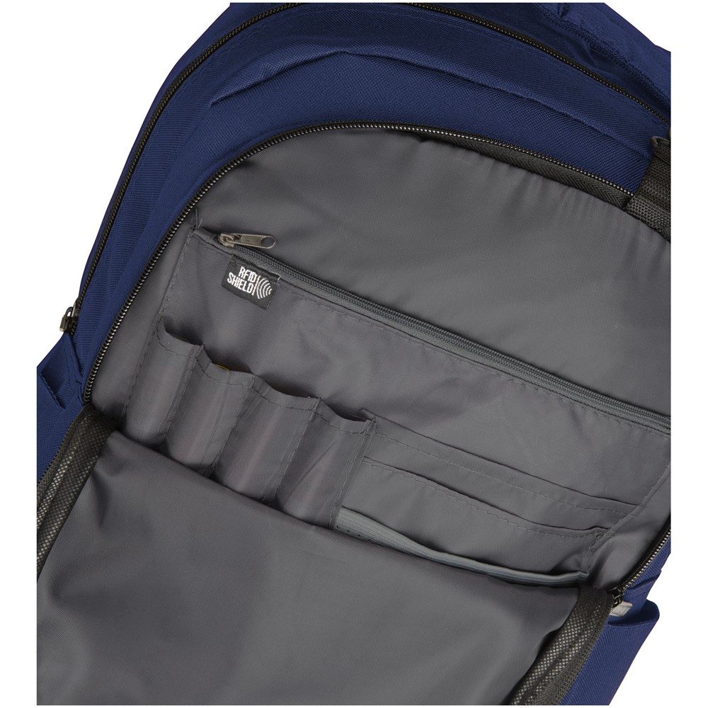 Strakke, moderne 15 "laptop rugzak met een grote voorzijde rits met sleutelhangerhouder. Een verborgen RFID-technologie beschermt je bankpassen en paspoort tegen identiteitsfraude. Het grote gevoerde hoofdvak biedt plaats voor een 15" laptop en een apart gevoerd vak voor iPad of tablet. De voorste verticale rits is ontworpen om snel toegang tot het voorvak tegeven. 2 extra zijvakken voor extra opslagruimte en de verstelbare gevoerde schouderbanden met singels details zijn comfortabel. Het handvat en een trolleyband maakt het reizen makkelijk. Er kunnen kleine variaties voorkomen in de kleur van het eigenlijke product, vanwege de aard van de kleurstoffen, de weefsels en de bedrukking.