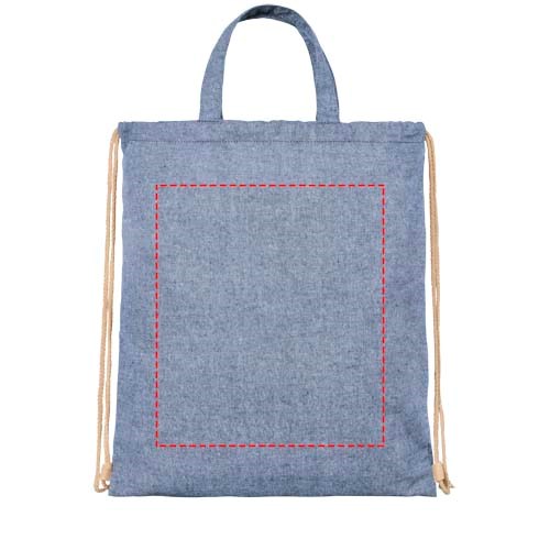 Trekkoordrugzak van 210 g/m² gerecycled katoen-polyester mix. Gerecycled katoen wordt vervaardigd uit voor consumenten bestemd afval dat in textielfabrieken tijdens het snijproces wordt geproduceerd. Groot hoofdvak met katoenen trekkoordsluiting. Voorzien van twee handgrepen met een valhoogte van 14 cm. Door de aard van het productieproces kunnen er kleine variaties zijn in de kleur van het daadwerkelijke product. Geschikt voor een gewicht tot 5 kg.
