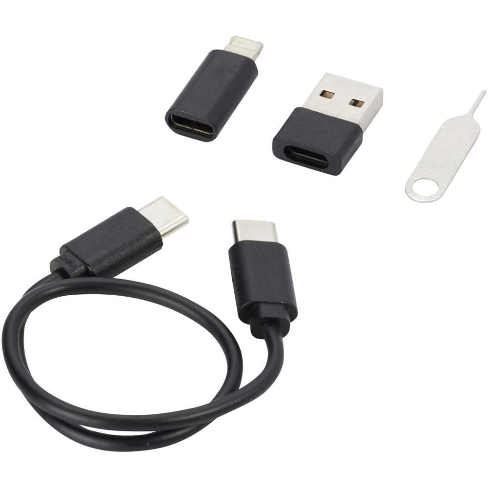 Modulaire gegevensoverdracht- en oplaadkabel gemaakt van gerecycled plastic, geleverd in een elegante opbergdoos die ook dienst doet als telefoonstandaard. De kabel biedt meerdere oplaadoplossingen: Type-C- en USB-A-ingang en Type-C/iOS/micro USB-uitgang. Dankzij al deze adapters en connectoren kun je met deze kabel de meeste smartphones, camera's, powerbanks, oordopjes enz. opladen. De kabel heeft een maximaal uitgangsvermogen van 2 A. Voorzien van een uitwerppin die handig is wanneer je de simkaart uit je telefoon moet halen. De opbergdoos biedt ook ruimte voor het opbergen van een micro SD-geheugenkaart en een nano-simkaart, waardoor dit het perfecte reisaccessoire is. Kabellengte: 26 cm. Geleverd in een envelop van 100% gerecycled kraftpapier.