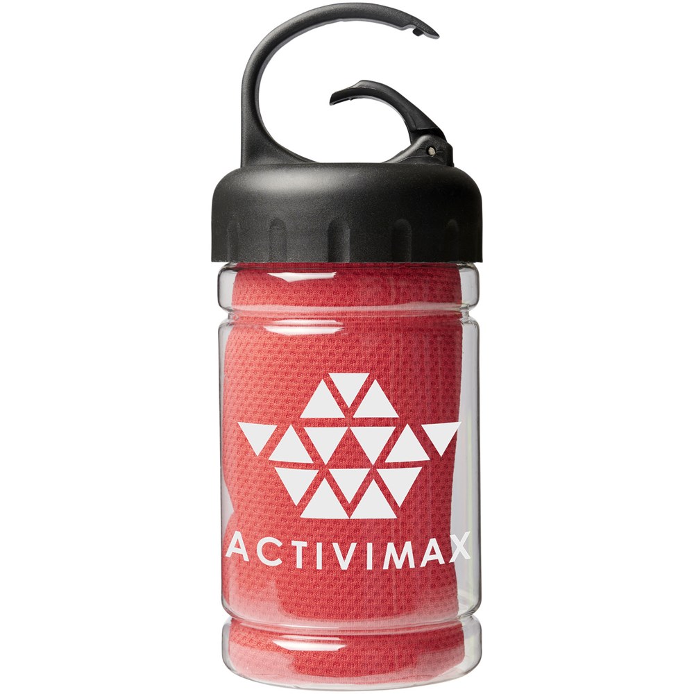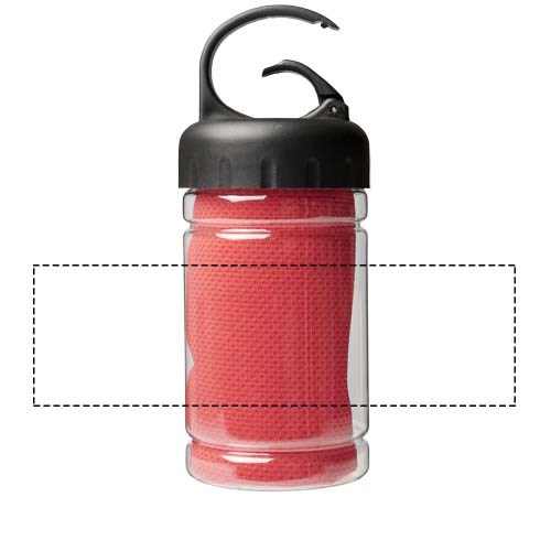 Snel absorberende, sneldrogende en wasbare koelhanddoek gemaakt van sterk en duurzaam polyester voor het koel houden tijdens de training of een buitenactiviteit. Wordt geleverd in een PET-verpakking met draagbeugel en ingebouwde karabijnhaak voor gemakkelijk vervoer. Verkrijgbaar in 5 frisse kleuren. Groot decoratievlak voor het logo op de verpakking, decoratie ook mogelijk op de koelhanddoek zelf. Maat: 30 x 80 cm.