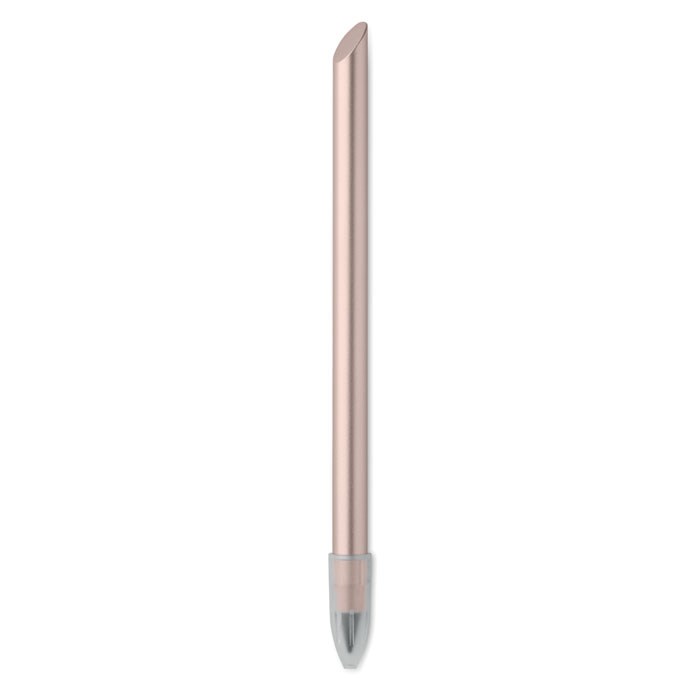 Duurzame inktloze pen van gerecycled aluminium. De pen schrijft met de grafietpunt die een plastic beschermkap heeft.