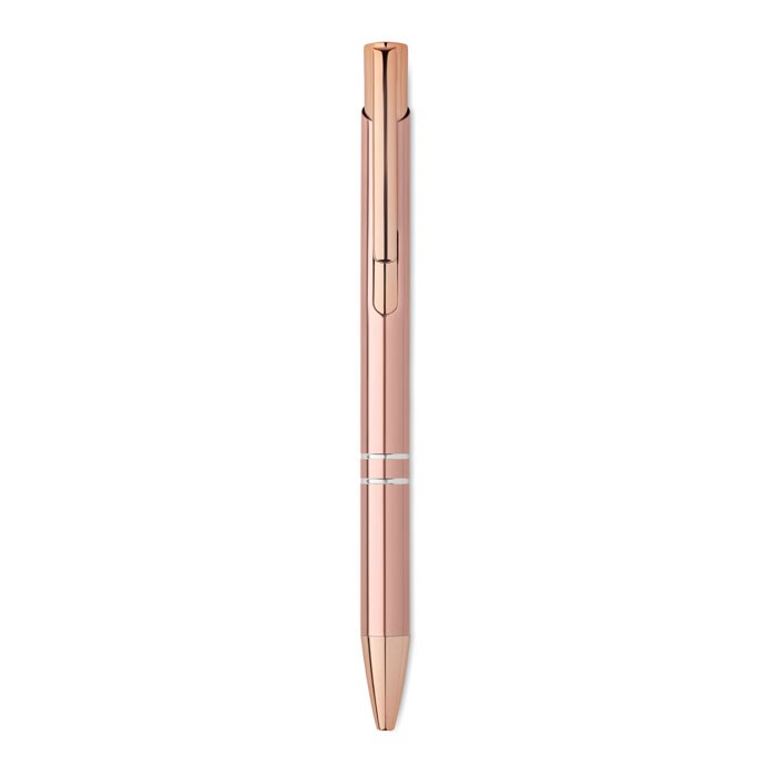 Pen met drukknop van gerecycled aluminium en roségouden details. Blauwe inkt.meer