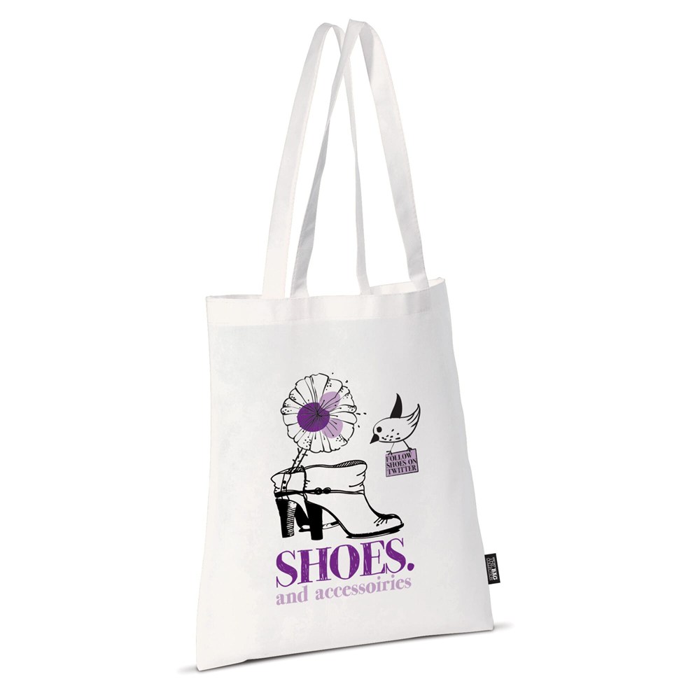 Witte non-woven schoudertas met lange hengsels gemaakt van lichte vezels. Vanaf 10.000 stuks diverse afmetingen mogelijk.