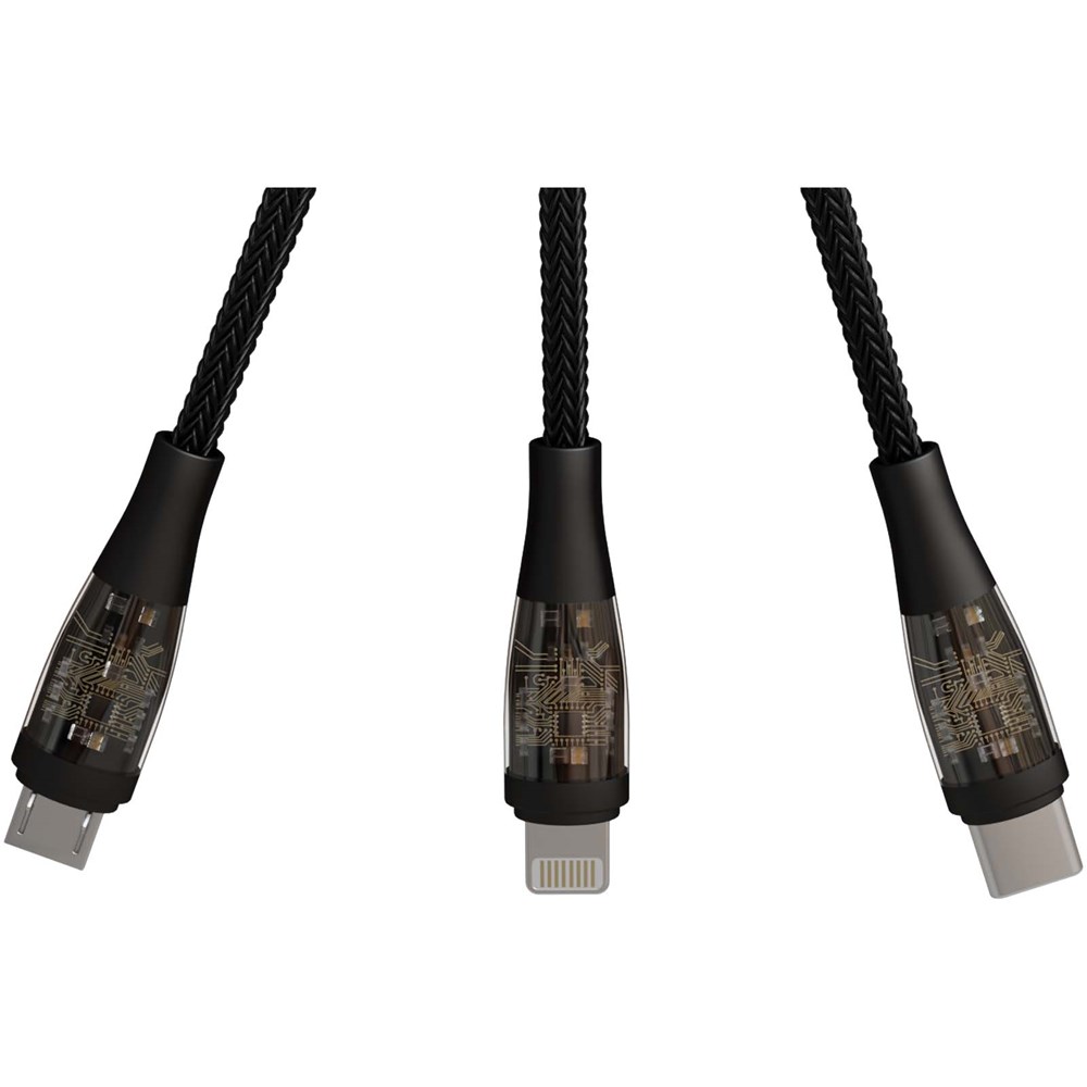 5-in-1 kabel voor snel opladen en gegevensoverdracht. Ingang: USB-A/USB-C. Uitgang: Micro USB/Type-C/Lightning. Snel opladen: 100 W/5 A. Transparante stekkers. Digitaal display met overdrachtsnelheid aan de voorkant en oplichtend logo aan de achterkant.