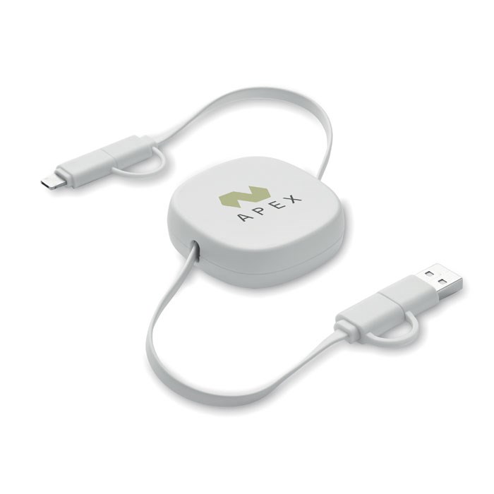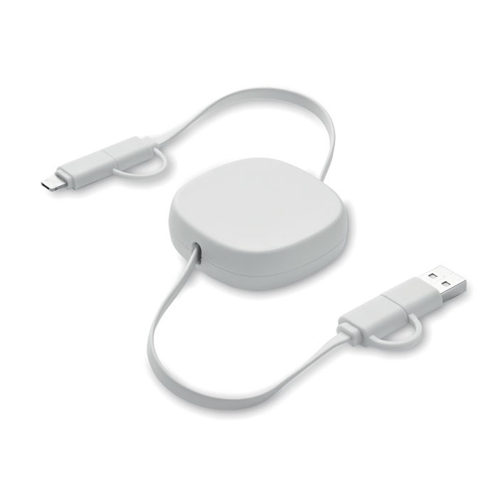 60W oplaadkabel met intrekbaar mechanisme in gerecyclede ABS-behuizing. Ingang: 2-in-1 Type-C en Type-A. Uitgang: Type-C en micro-B (2-in-1 pin). Kabellengte: 80 cm.