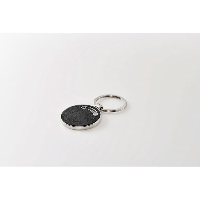 Ronde metalen sleutelhanger met inleg van gerecycled PU-leer.