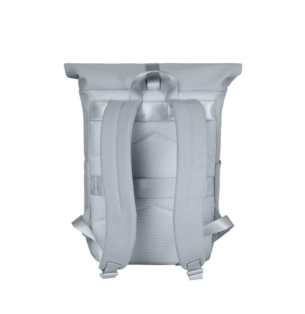 modieuze roll-top-rugzak; hoofdvak met ritssluiting met verstelbaar sluitsysteem; lusband op de flap; waardevolle metalen accessoires; gevoerd apparaatvak; voorvak met ritssluiting; twee insteekvakken aan de zijkant; gevoerde bodem; gevoerd draagsysteem; bevestigingslus voor trolleystang aan de achterkant; handgreep