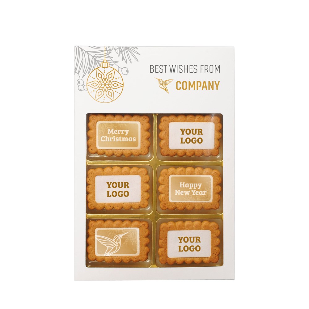 8 koekjes met karamel smaak, ca. 40 gram in een doosje. Voorzien van een full colour bedrukking op de koekjes en het doosje