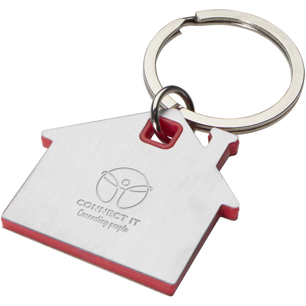 Sleutelhanger in de vorm van een huis, met een roestvrijstalen plaatje met een mat design aan de voor- en achterkant en een gekleurde plastic chip in het midden.