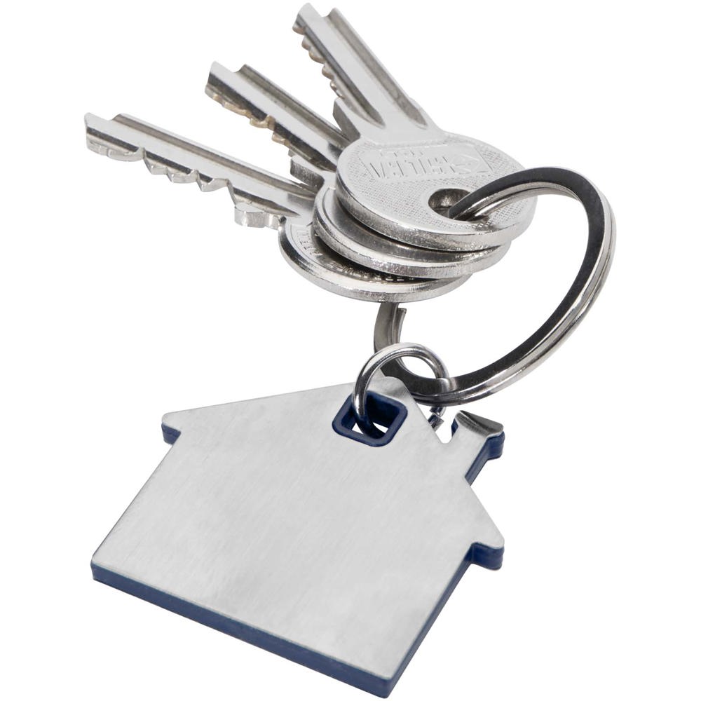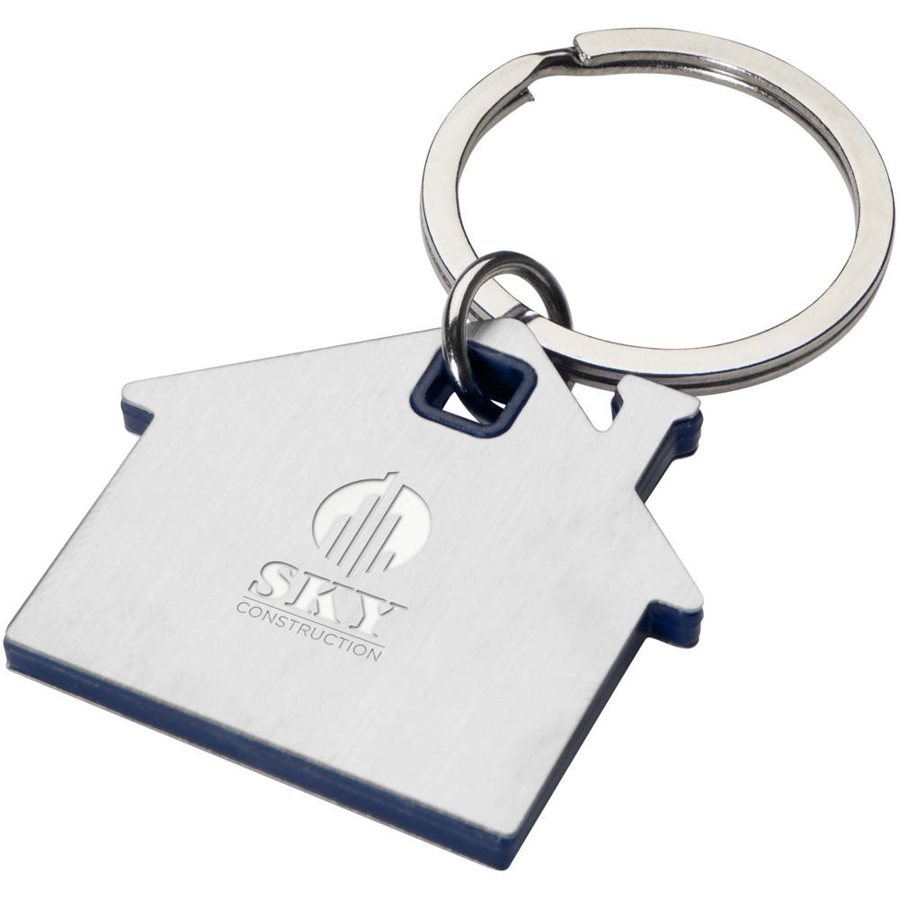 Sleutelhanger in de vorm van een huis, met een roestvrijstalen plaatje met een mat design aan de voor- en achterkant en een gekleurde plastic chip in het midden.