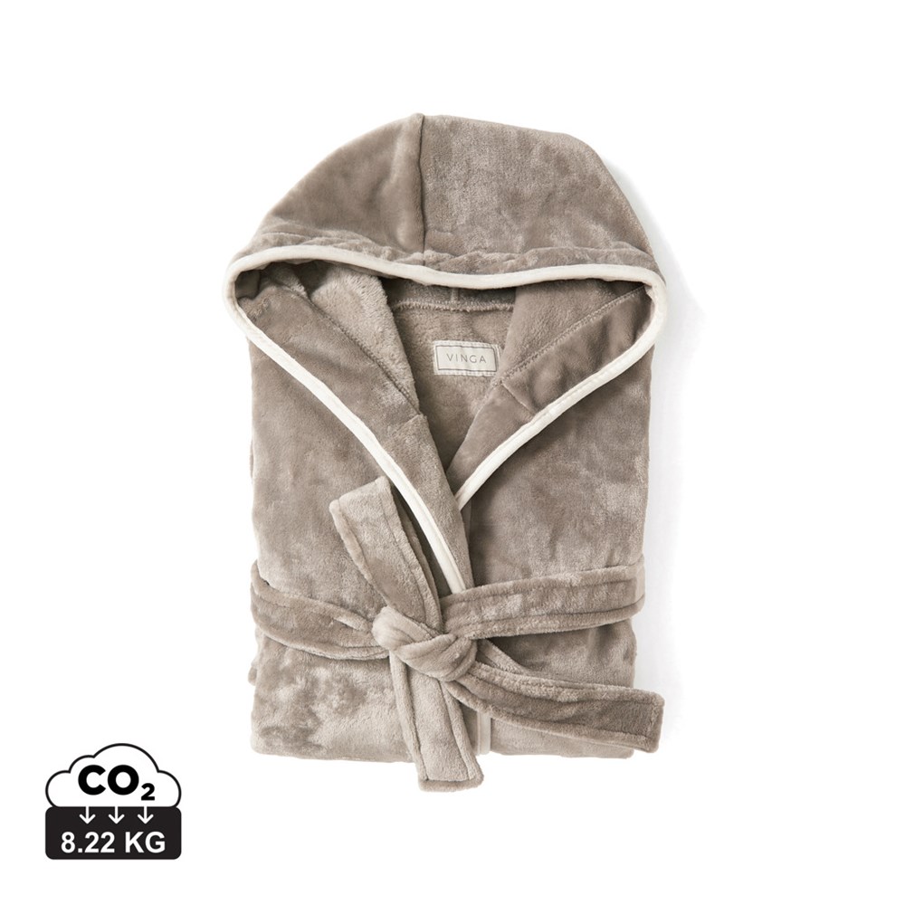 Knusse en zachte badjas van luxe pluche met grote capuchon en decoratieve biezen. Twee zakken aan de voorzijde en ceintuur in de taille. De badjas is gemaakt van 68% geverifieerd gerecycled materiaal. We houden niet van luchttransport, dus hebben we ervoor gekozen om deze kamerjas vacuüm te verpakken om onze ecologische voetafdruk te verkleinen. Vervaardigd door GRS (Global Recycled Standard) GRS-certificering zorgt ervoor dat de gehele toeleveringsketen van de gerecyclede materialen gecertificeerd is. Totale gerecyclede inhoud is gebaseerd op het totale productgewicht. Maat L/XL. OEKO-TEX® STANDARD 100. 19.HCN.76049. Hohenstein HTTI.